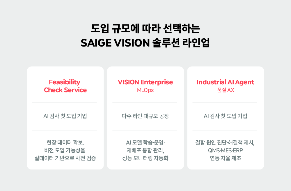 세이지는 이 문제를 SAIGE VISION으로 풀어냅니다. 처음 AI 검사를 시작하는 기업부터 대규모 공장 전체를 통합 운영하는 기업까지, 도입 규모와 수준에 맞게 선택할 수 있는 솔루션 라인업을 갖추고 있습니다.