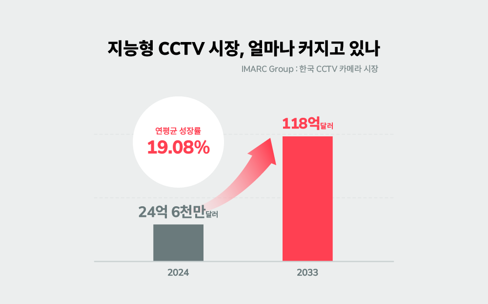 국내 시장도 가파른 성장 궤도에 올라 있다. IMARC Group에 따르면 한국 CCTV 카메라 시장은 2024년 약 24억 6천만 달러 규모로, 2033년까지 118억 달러에 달할 것으로 예상되며 연평균 성장률은 19.08%에 이른다.