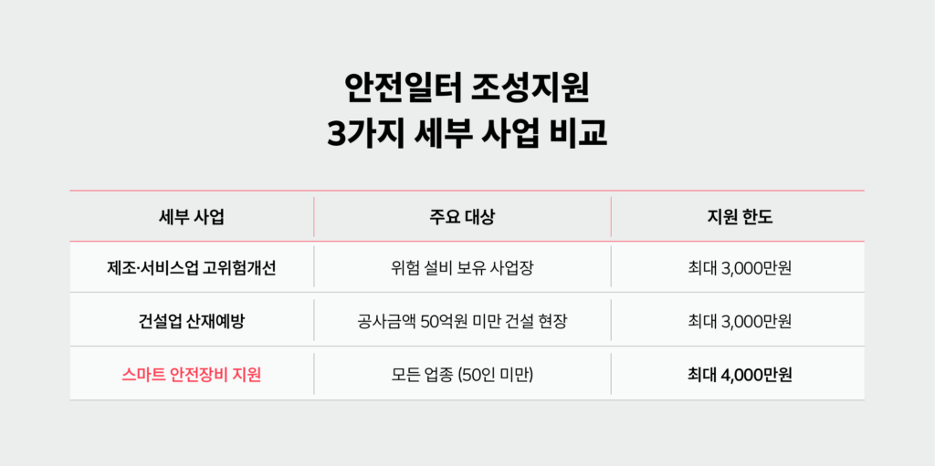 스마트 안전장비 지원사업은 업종 제한이 가장 적고, 지원 한도가 가장 높으며, 기존 시설을 활용할 수 있어 대부분의 중소기업에게 가장 실용적인 선택입니다.