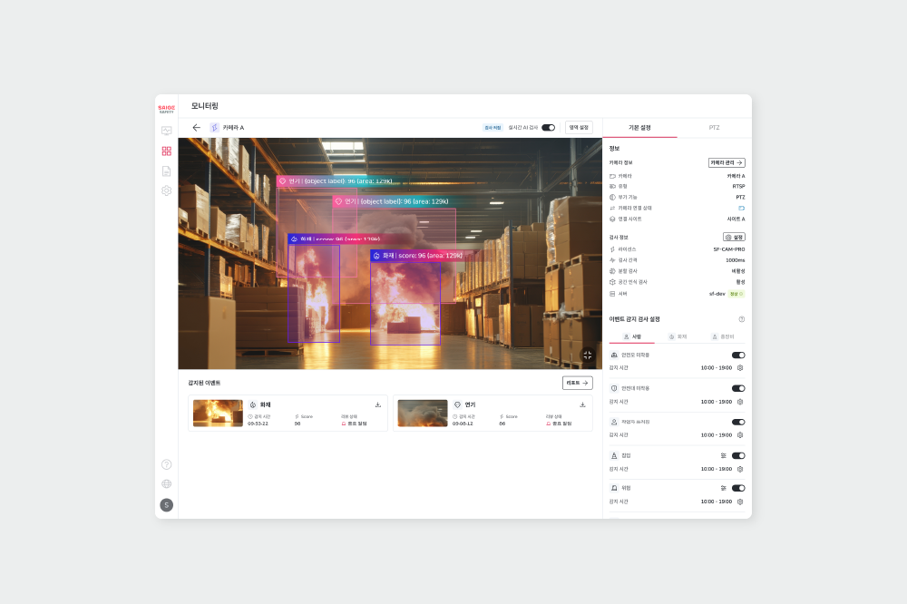 인력과 예산이 부족한 중소 제조기업에게 현실적인 대안은 AI 기반 안전 모니터링 시스템입니다. AI는 사람과 달리 24시간 쉬지 않고 현장을 감시할 수 있습니다. 안전관리자가 자리를 비우거나 야간 근무 시간에도 CCTV를 통해 현장 상황을 지속적으로 분석하죠. 화재나 연기 발생, 작업자 쓰러짐, 안전모 미착용, 위험구역 침입 등 약 10가지 핵심 안전 이벤트를 실시간으로 감지합니다.