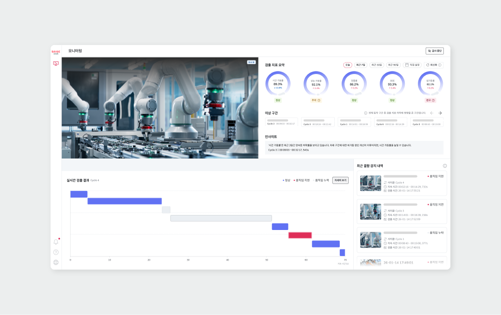 SAIGE VIMS는 설비 실 가동률과 구간별 택타임 준수율을 실시간으로 제공하고, 이상 이벤트 영상을 자동 저장·통계 분석해 경험이 아닌 데이터로 공정을 개선하는 환경을 만든다.