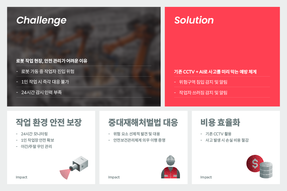 위험물 적재구역이 밀집한 민간 항만 터미널의 화재·연기 실시간 자동 감지 및 24시간 무인 모니터링 체계 구축을 위한 SAIGE SAFETY AI 솔루션 도입 한 사례입니다. Challenge 💡광대한 항만 터미널, 화재 감시가 어려운 이유 Solution 위험물 밀집 구역 중심 AI 자동 화재 감지 체계 구축 Impact 광범위한 터미널 전체를 실효성 있게 보호 도입 시기: 2025년 3분기 적용 […]