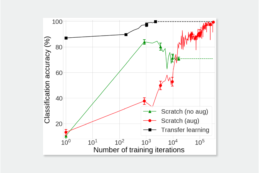 The experiment’s results are shown in [Figure 4]. First, scratch (no aug) converges to a low classification accuracy point (70.87%). This indicates that over-fitting occurs when training a deep network with a small amount of data, such as the DAGM dataset. As confirmed by the results of scratch (aug), over-fitting can be solved by data augmentation, but it requires a very long training time (320k iterations) to converge to the final accuracy (99.55%).