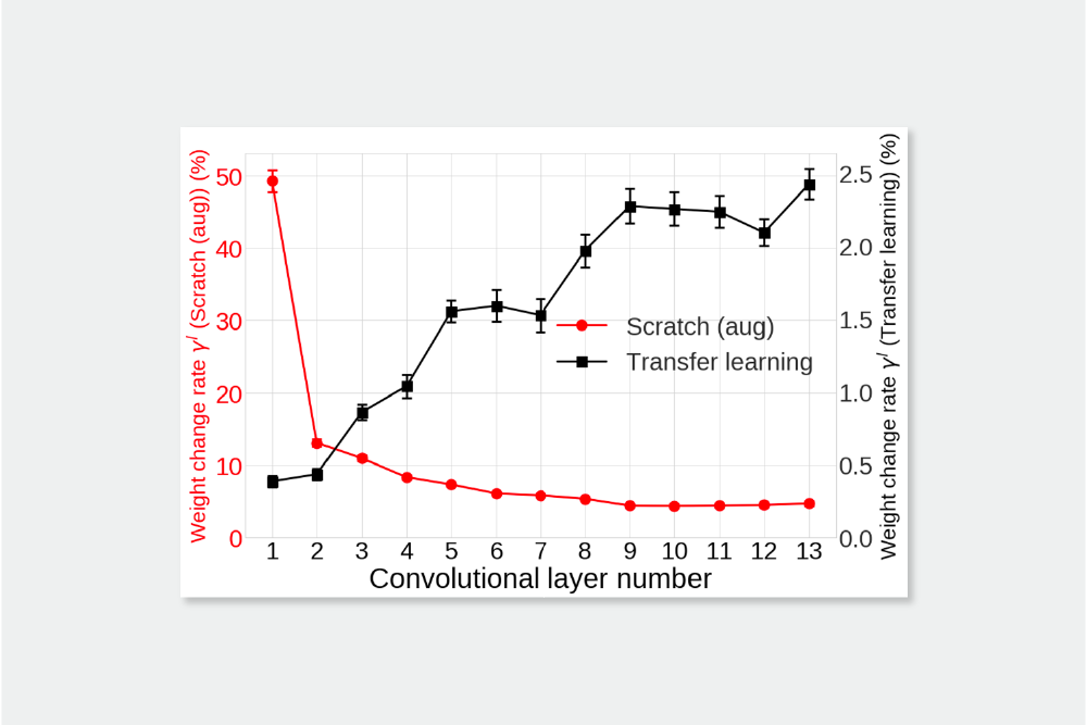 [Figure 5] compares the weight change rates at each layer in transfer learning and Scratch (aug) after learning convergence. Interestingly, the weight change rates in the two networks exhibit completely opposite trends. We can see that significantly less weight change occurred in transfer learning compared to Scratch (aug).