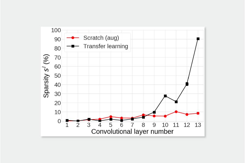 [Figure 6] presents the comparison of sparsity in each layer between transfer learning and Scratch (aug). It is evident that there is a significant difference in sparsity between the two networks. First, the lower layers of transfer learning () have values close to zero, which means that very dense features learned from the source network are being extracted in the lower layers of transfer learning. However, starting from the 9th layer, sparsity begins to increase, and it sharply rises towards the end (90.4%), showing a substantial difference from Scratch (aug) values (8.44%).