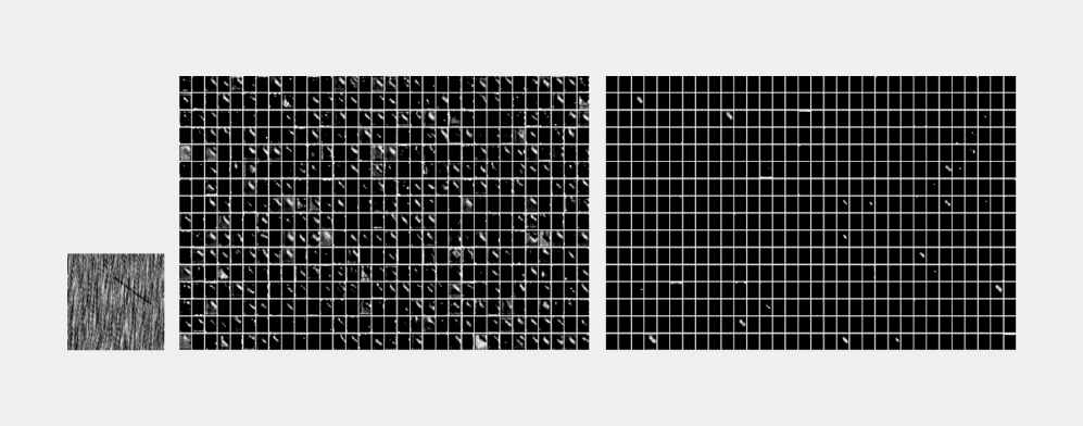 [Figure 7] is a visualization of the output features of the last convolutional layer of Scratch (aug) and transfer learning, when given the same data. As you can see from the figure, most of the features in transfer learning are deactivated, and the few features that are activated accurately represent the defects in the image. The features in Scratch (aug) also represent the defect areas relatively accurately, but they are much denser compared to transfer learning.