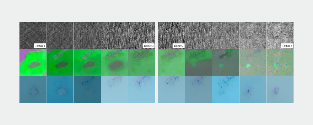 The result of applying these concepts to our research case is shown in [Figure 9]. The middle row visualizes the features of Scratch (aug) and the last row visualizes the features of transfer learning when linearly interpolating between Texture 1 and Texture 2 classes, and between Texture 2 and Texture 5 classes in the DAGM dataset. In the case of Scratch (aug), there are many areas where both classes’ defects coexist during interpolation between different classes. We can see that the features of Scratch (aug) are less disentangled, as explained in [Figure 8]. On the other hand, the features of transfer learning have much fewer overlapping defects during interpolation. This confirms that the features of transfer learning are more disentangled than Scratch (aug).