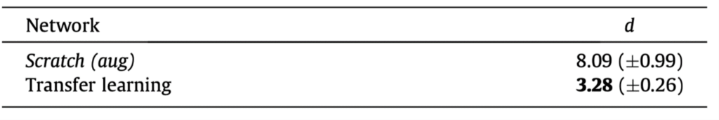 Quantitative metrics for disentanglement in features can be measured using the method proposed by P.P. Brahma et al. (2016). Here, the quantitative metric involves calculating the difference between the Euclidean distance and the geodesic distance between two points in the feature space. In a completely flat manifold, the Euclidean distance and the geodesic distance between the two points are equal. Therefore, smaller values of the quantitative metric proposed by P.P. Brahma et al. (2016) indicate that the features are more disentangled . Calculating the disentanglement quantitative metrics for both networks result in [Table 1]. According to the results, the manifold of features learned by transfer learning is flatter, indicating that it is more disentangled.